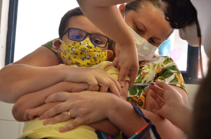 A vacina da covid-19 é aplicada em crianças de 5 a 11 anos, em um esquema vacinal de duas doses, com intervalo de quatro semanas entre a primeira e segunda dose no caso de quem tomou o imunizante Coronavac e de oito semanas para quem recebeu o imunizante Pfizer.