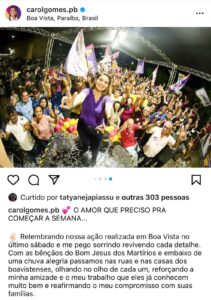 Com as bênçãos do Bom Jesus dos Martírios e embaixo de uma chuva de alegria passamos nas ruas e nas casas dos boavistenses, olhando no olho de cada um, reforçando a minha amizade e o meu trabalho que eles já conhecem muito bem e reafirmando o meu compromisso com suas famílias”, afirmou Carol Gomes.