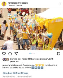 O candidato a deputado federal, Romero Rodrigues (PSC), participou de uma grande carreata na cidade de Campina Grande, no domingo (25), acompanhado do candidato ao governo Pedro Cunha Lima (PSDB), do candidato ao Senado, Efraim Filho (UNIÃO), do prefeito de Campina Grande, Bruno Cunha Lima (PSD) e do ex senador Cássio Cunha Lima.