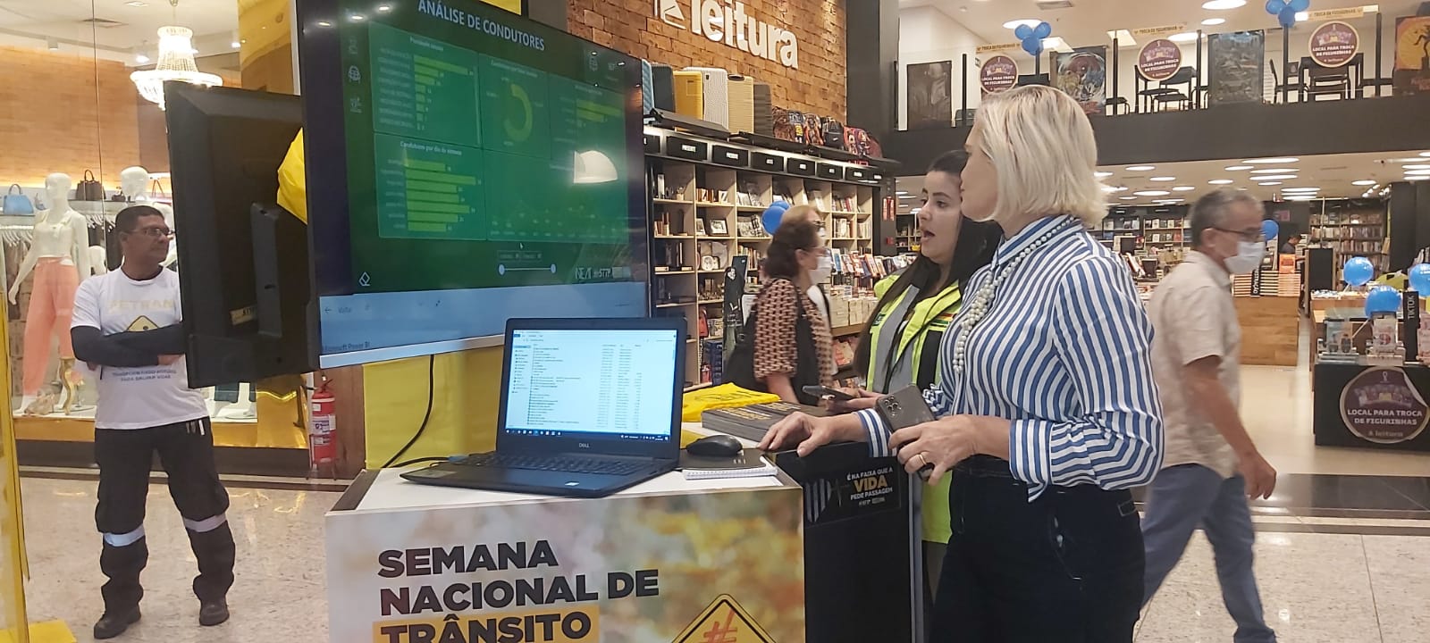 O quiosque interativo da Semana Nacional de Trânsito tem a participação de agentes de trânsito, monitores do DET, além de técnicos do NEAT, que estão interagindo com o público que passa pelo local orientando com dicas de segurança de trânsito para motoristas, motociclistas, ciclistas e pedestres.