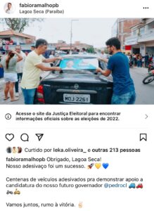 O “adesivaço”, foi abraçado com muito carinho pelos moradores locais. “Obrigado, Lagoa Seca! Nosso adesivaço foi um sucesso. Centenas de veículos adesivados pra demonstrar apoio a candidatura do nosso futuro governador @pedrocl”, escreveu Fábio Ramalho.