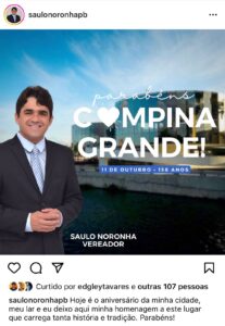 O vereador Saulo Noronha (SD) parabeniza a cidade de Campina Grande pelo transcurso de seu aniversário de 158 anos, comemorados nesta terça-feira, 11 de outubro.