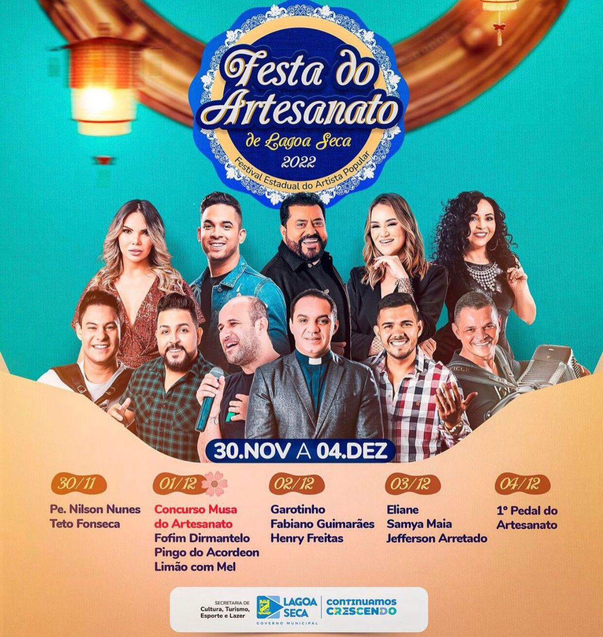 A cidade de Lagoa Seca vai festejar novamente a cultura do artesanato. Onde acontece, de 30 de novembro a 04 de dezembro, a Festa do Artesanato – O Festival Estadual do Artista Popular. A programação divulgada nas redes sociais da prefeitura.
