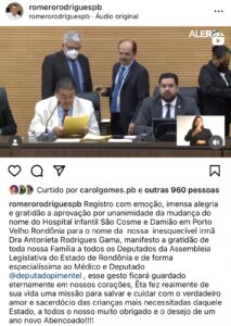 O ex-prefeito de Campina Grande, Romero Rodrigues, usou seu perfil numa rede social para agradecer e comemorar homenagem prestada à sua irmã Antonieta Rodrigues Gama pela Assembleia Legislativa de Rondônia.