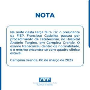 O presidente da Federação das Indústrias do Estado da Paraíba – FIEP, Francisco Gadelha, passou por um procedimento de cateterismo, no Hospital Antônio Targino, em Campina Grande. O procedimento foi realizado na noite da terça-feira (07).