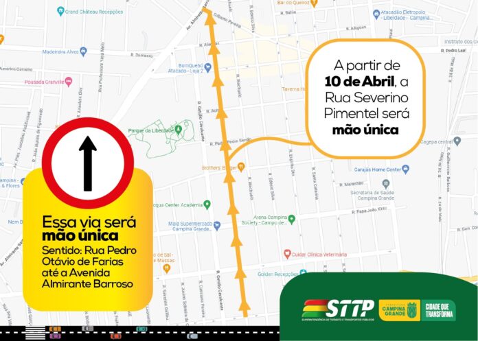 A Prefeitura de Campina Grande, por meio da Superintendência de Trânsito e Transportes Públicos (STTP), está realizando diversas ações de melhoria na mobilidade urbana no bairro da Liberdade. Dentro deste trabalho, a partir de 10 de abril, a rua Severino Pimentel (que passa pela lateral do Supermercado Bom Q Só) será mão única, da rua Pedro Otávio de Farias até a Avenida Almirante Barroso.