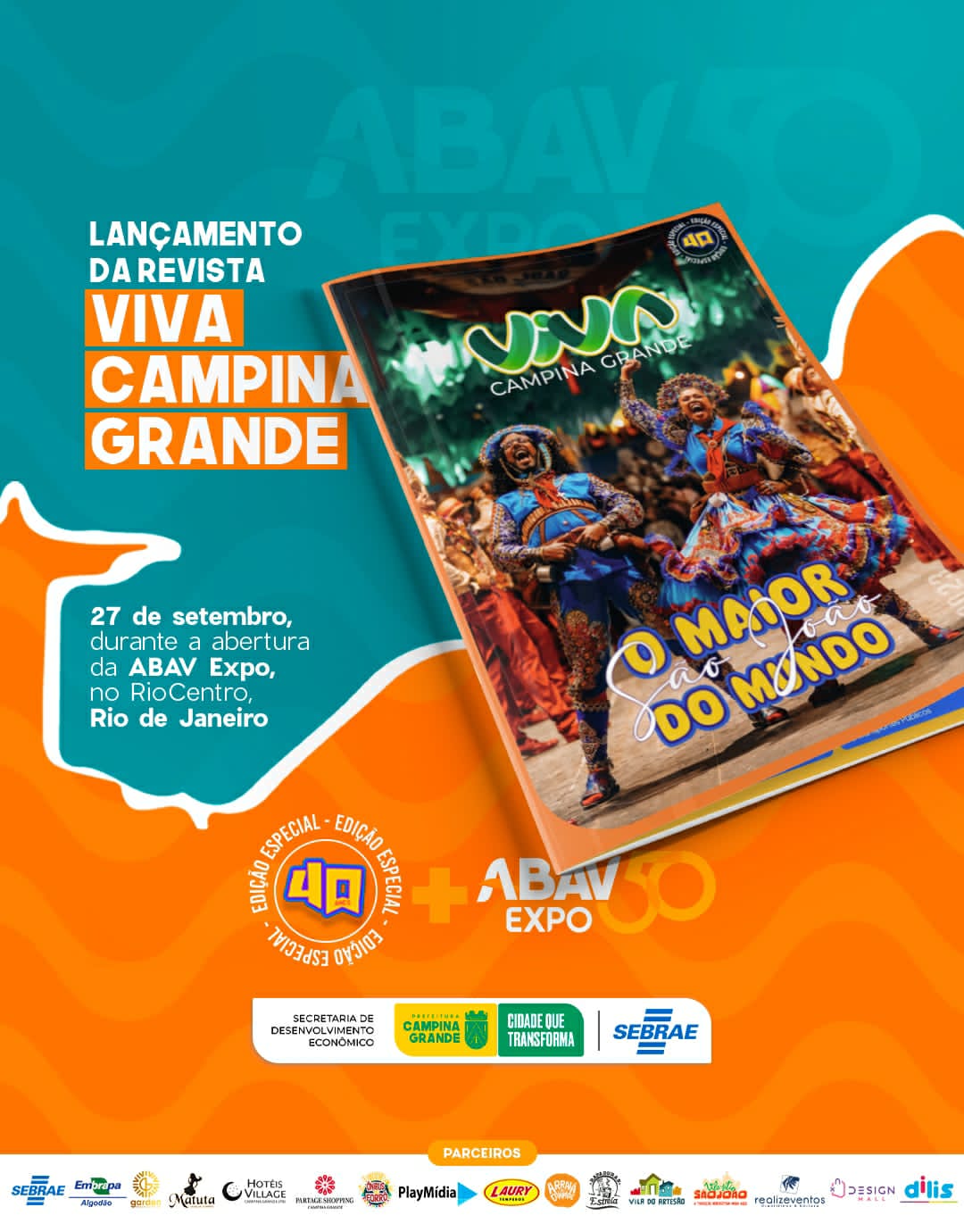 Nesta quarta-feira (27) estará sendo lançada na ABAV Expo 2023 a revista “Viva Campina Grande” em comemoração aos 40 anos d’O Maior São João do Mundo. Essa é uma ação da Prefeitura de Campina Grande através da Secretaria de Desenvolvimento Econômico, que irá divulgar todo o potencial turístico da cidade em um dos maiores eventos de turismo da América Latina. Neste ano, o evento estará acontecendo de 27 a 29 de setembro no Rio de Janeiro, e terá uma comitiva de Campina Grande marcando presença com um estande exclusivo.