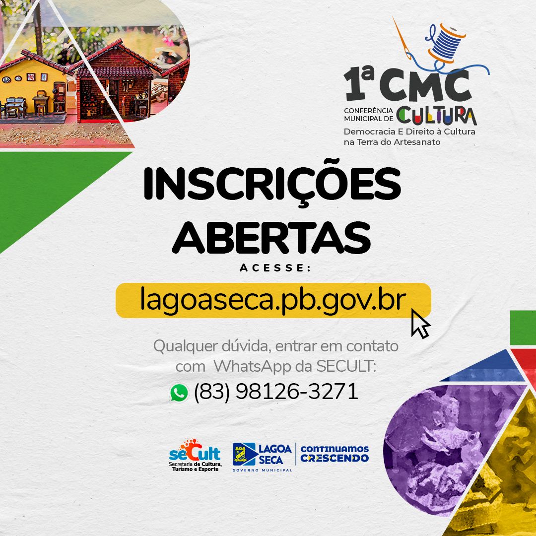 A Prefeitura de Lagoa Seca, por meio da Secretaria de Cultura, Turismo e Esportes, promoverá a 1° Conferência Municipal de Cultura de Lagoa Seca. O evento acontecerá na próxima quinta-feira, 26 de outubro, das 8h às 17h, no Centro de Eventos Marista e é aberto para todo público. Para participar, é necessária inscrição via formulário, através do link: https://docs.google.com/forms/d/e/1FAIpQLSeX1tlo_SpdQsnrWh-Bkn2C7guyY983JJ_Wze-RttpmBHTqYQ/viewform?usp=sf_link