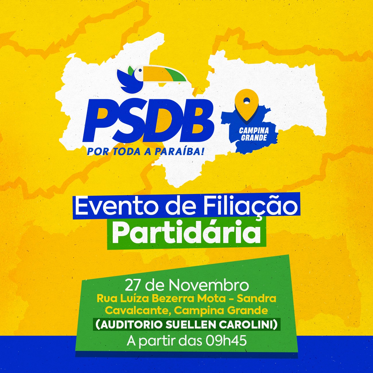 O Partido da Social Democracia Brasileira realizará, na próxima segunda dia 27 de outubro, um evento para a filiação de novas lideranças de toda Paraíba. O evento ocorrerá no auditório do Suellen Caroline às 9h45 em Campina Grande. Dentre as presenças já confirmadas estarão, os deputados estaduais Camila Toscano e Tovar Correia, O Presidente do partido e Deputado Estadual Fábio Ramalho, O Presidente do ITV Pedro Cunha Lima , a Presidente do PSDB mulher e ex-deputada estadual Iraê Lucena e o Presidente da Juventude do PSDB Thulio Veloso.