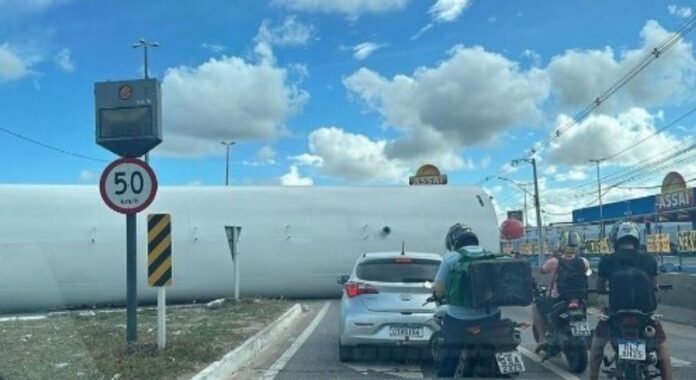 O veículo realizava o transporte de uma torre de energia eólica. o equipamento soltou-se da carreta e teria se soltado e caído na rodovia.