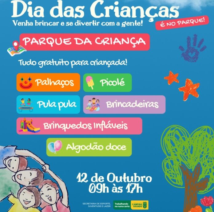 A Secretaria de Esporte, Juventude e Lazer (Sejel) da Prefeitura de Campina Grande, vai realizar no próximo dia 12 de outubro, no Parque da Criança, um dia festivo dedicado às crianças do município. A festa terá início às 9h e se estenderá até 17h. Um público estimado em dez mil pessoas está sendo esperado para a comemoração do Dia da Criança.