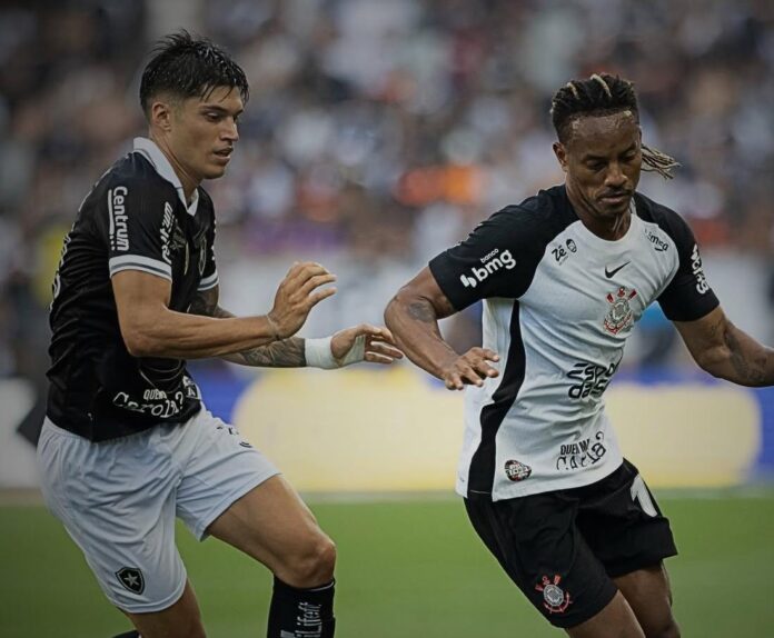 Uma desatenção do sistema defensivo do Botafogo, aproveitada com eficiência pelo Corinthians, foi a síntese do primeiro tempo e tirou o zero do placar em São Paulo. Aos sete minutos, Léo Linck saiu jogando com Newton na entrada da área, mas o volante acabou desarmado pelo meia Raniele, que entrou na área, recebeu do atacante Dieguinho e bateu na saída do goleiro.
