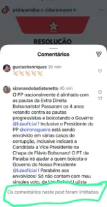 A limitação das interações ocorreu logo após a divulgação do posicionamento político da legenda, que caminha para formalizar apoio à candidatura de Lucas Ribeiro ao Governo do Estado em 2026. A estratégia, segundo a direção partidária, busca fortalecer o palanque do presidente Luiz Inácio Lula da Silva na Paraíba e ampliar a base eleitoral do partido.