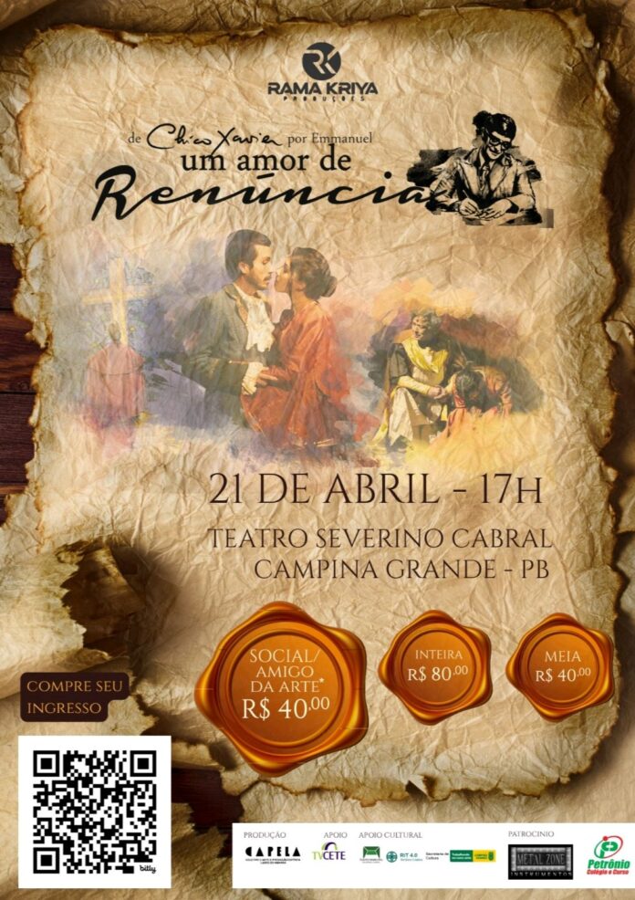 Em um momento especial de celebração ao Dia Nacional do Espiritismo (18 de abril), o público será presenteado com uma experiência única que une arte, espiritualidade e solidariedade. O espetáculo teatral “Um Amor de Renúncia”, baseado na consagrada obra Renúncia, psicografada por Chico Xavier e ditada pelo Espírito Emmanuel, chega à cidade prometendo emocionar e provocar profundas reflexões.