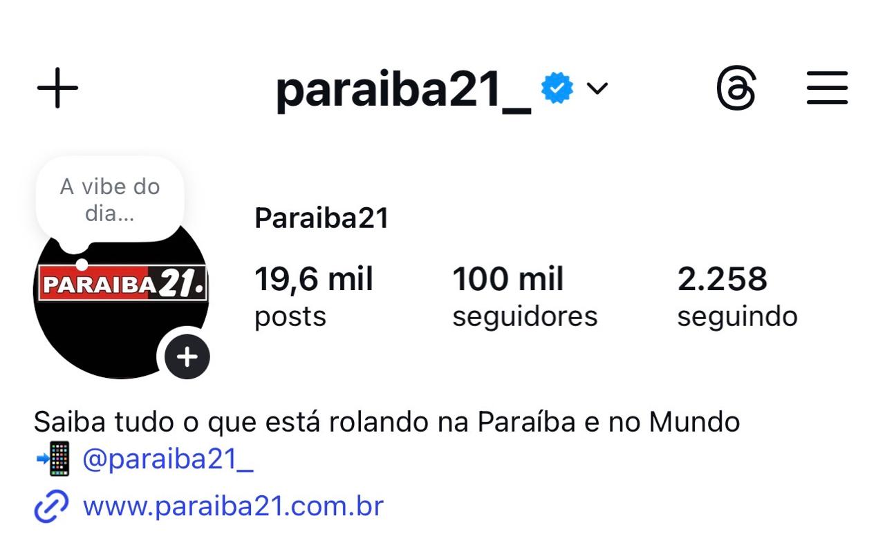 O portal de notícias Paraiba21 (www.paraiba21.com.br) celebra a marca de 100 mil seguidores no Instagram – Este marco não apenas reafirma sua posição como veículo de informação na Paraíba e região, mas também destaca seu crescimento exponencial e impacto significativo na comunidade que atinge. Reflete a confiança e o reconhecimento da nossa audiência junto ao público das redes sociais.